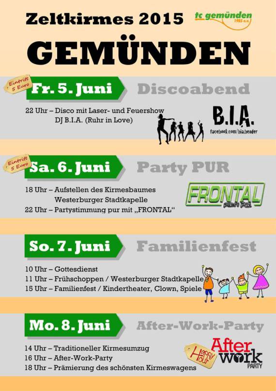 Vom 5. bis zum 8. Juni 2015 ist Ausdauer im Feiern angesagt, denn dann startet der TC Gemünden 1985 e.V. zur Zeltkirmes einen Party-Marathon, der es in sich hat. Spektakuläre Shows wechseln sich