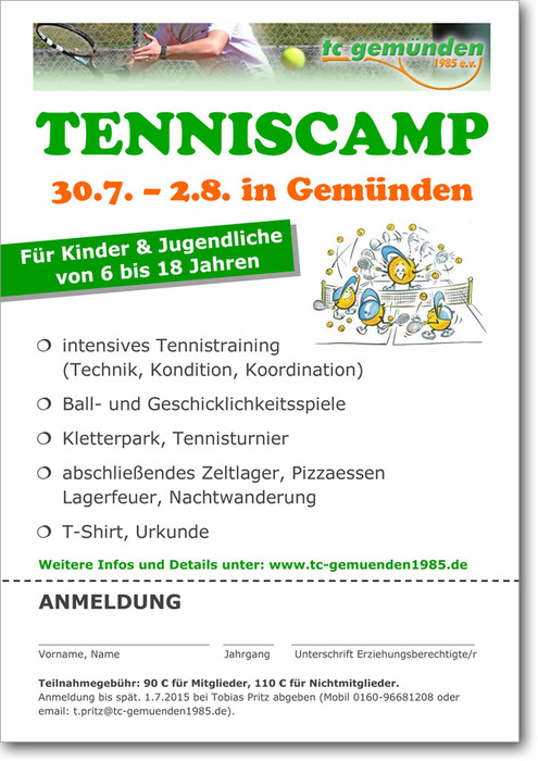 Zum ersten Mal veranstaltet der TC Gemünden auf seiner Anlage ein Tenniscamp für Kinder und Jugendliche im Alter von 6 bis 17 Jahren.